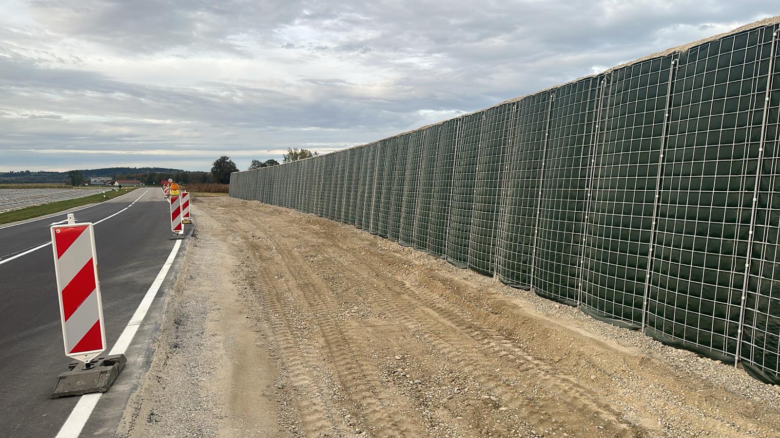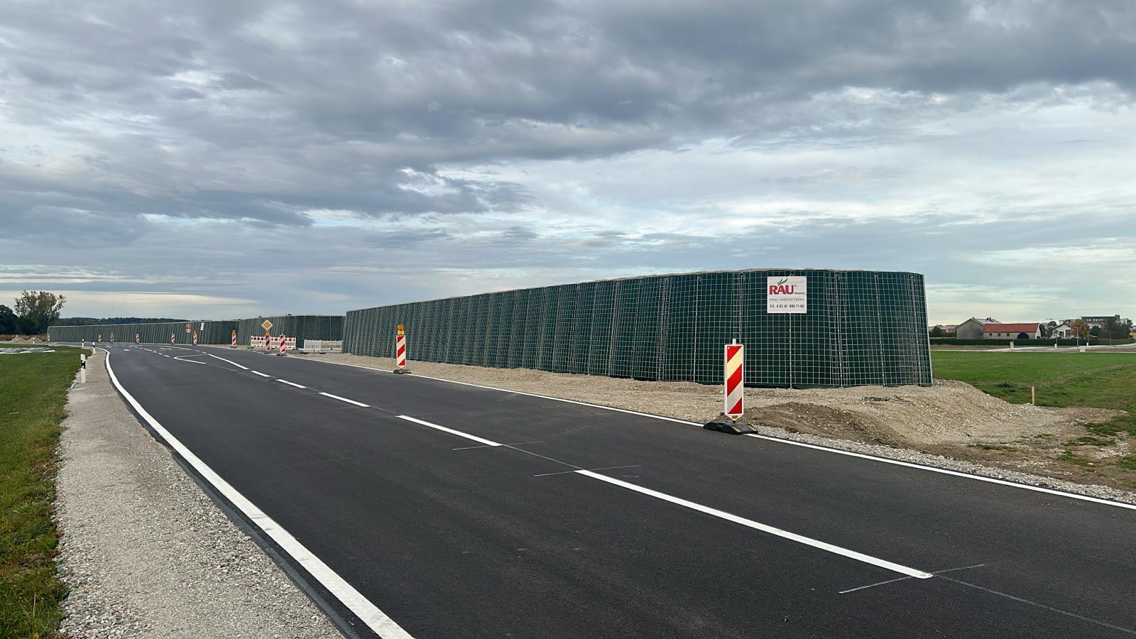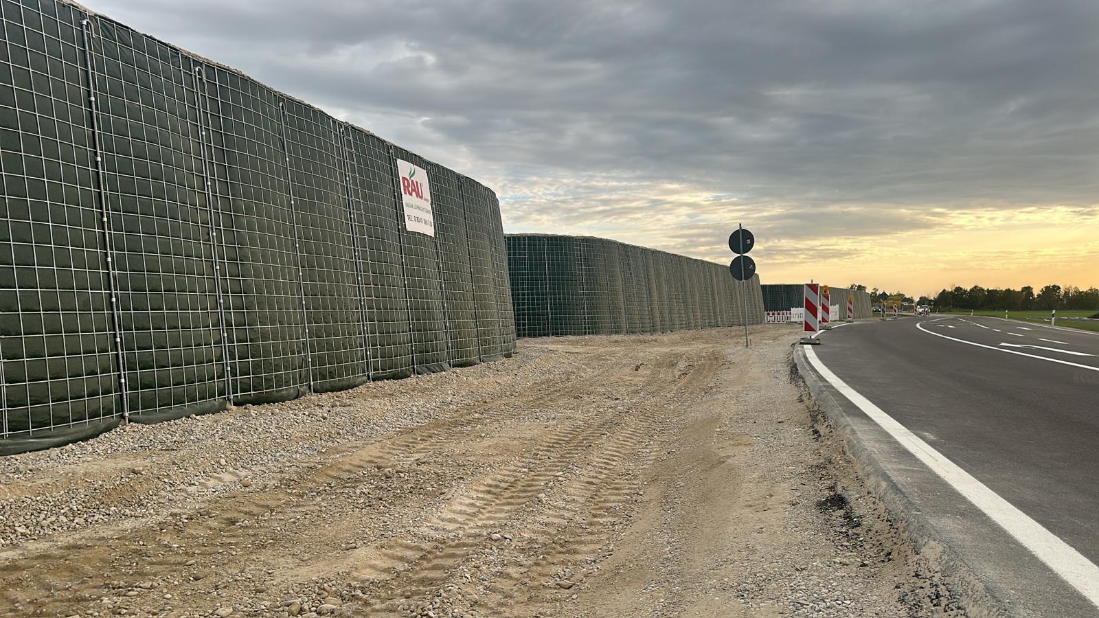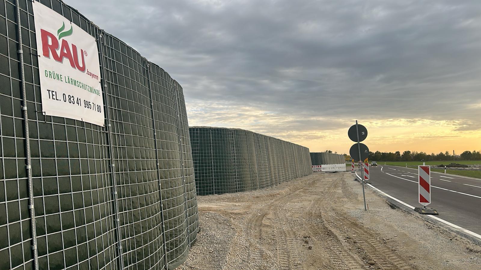 RAUbayern errichtet 204,15 m ökologischen Lärmschutz entlang des neuen Baugebietes in Mühldorf am Inn. An den zwei Durchlässen zum Wohngebiet und an Anfang und Ende wird die Lärmschutzwand in einem Viertelkreis gefertigt, um den seitlich auftreffenden Verkehrslärm effektiv abzuschirmen.