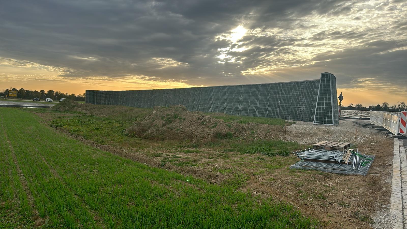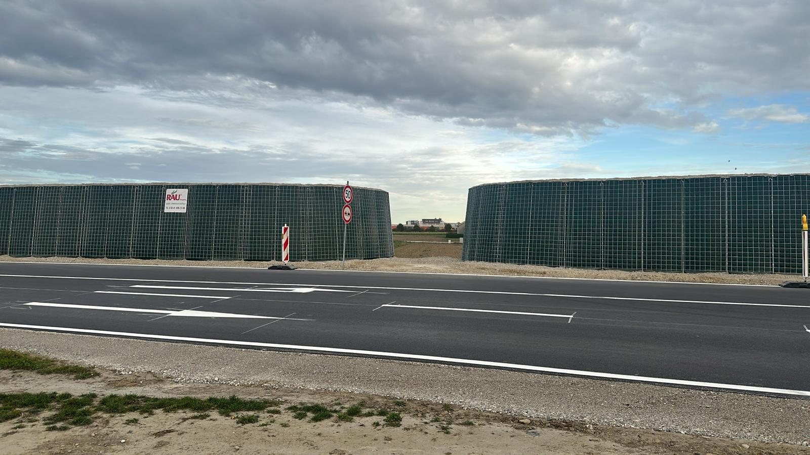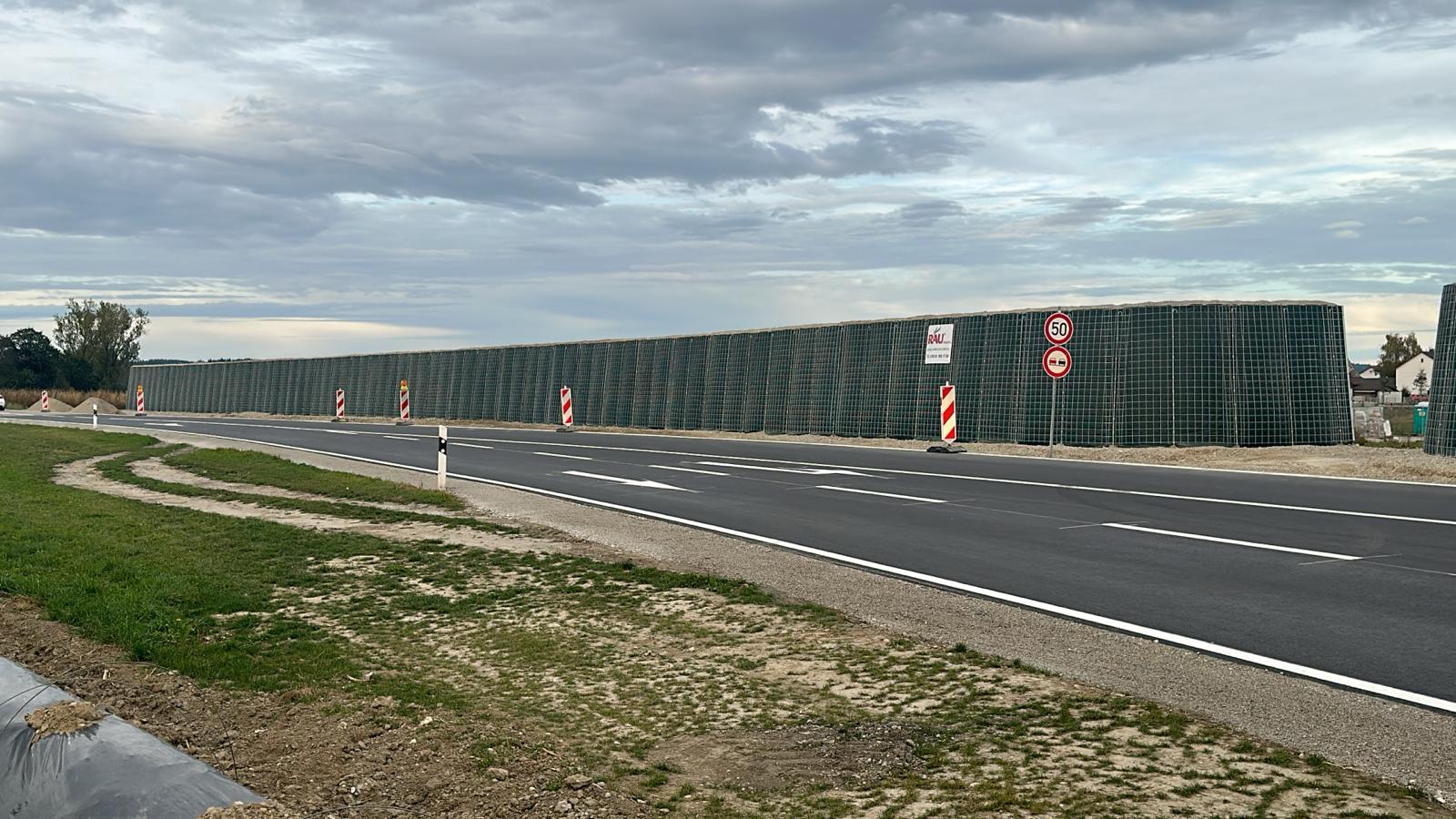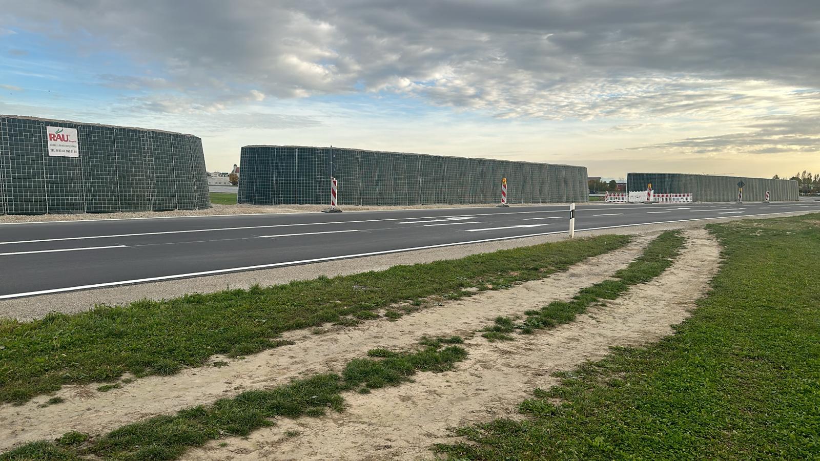 RAUbayern errichtet 204,15 m ökologischen Lärmschutz entlang des neuen Baugebietes in Mühldorf am Inn. An den zwei Durchlässen zum Wohngebiet und an Anfang und Ende wird die Lärmschutzwand in einem Viertelkreis gefertigt, um den seitlich auftreffenden Verkehrslärm effektiv abzuschirmen.