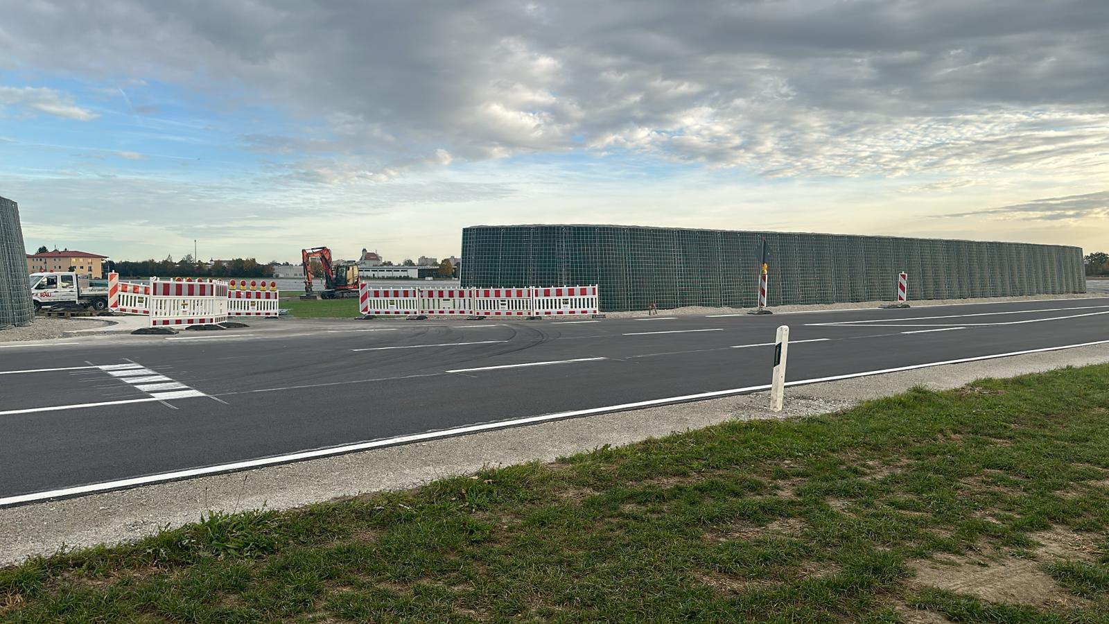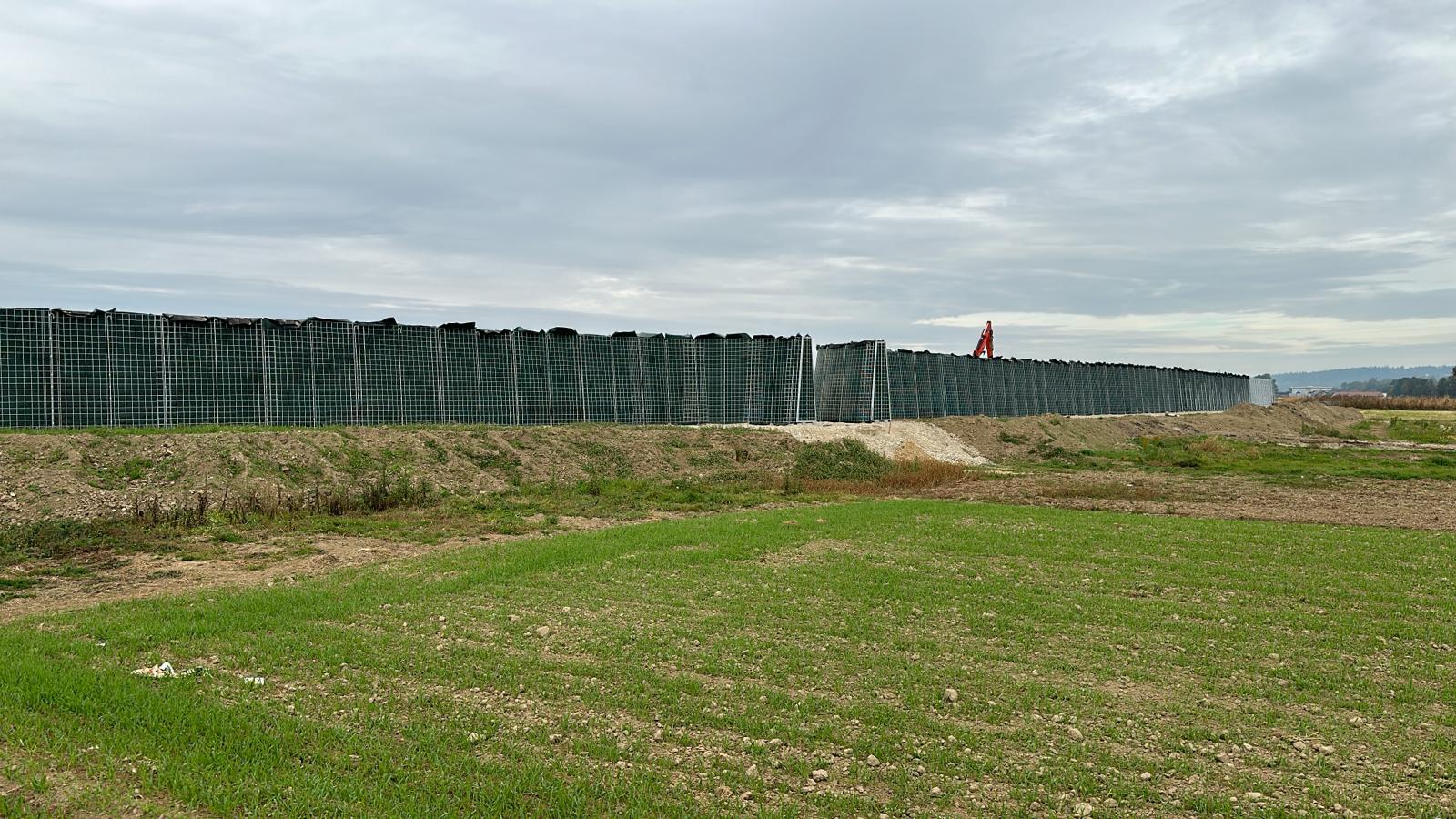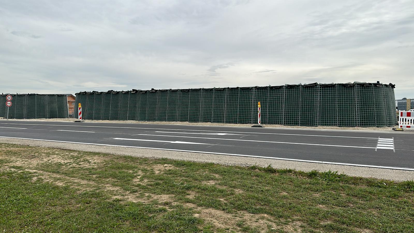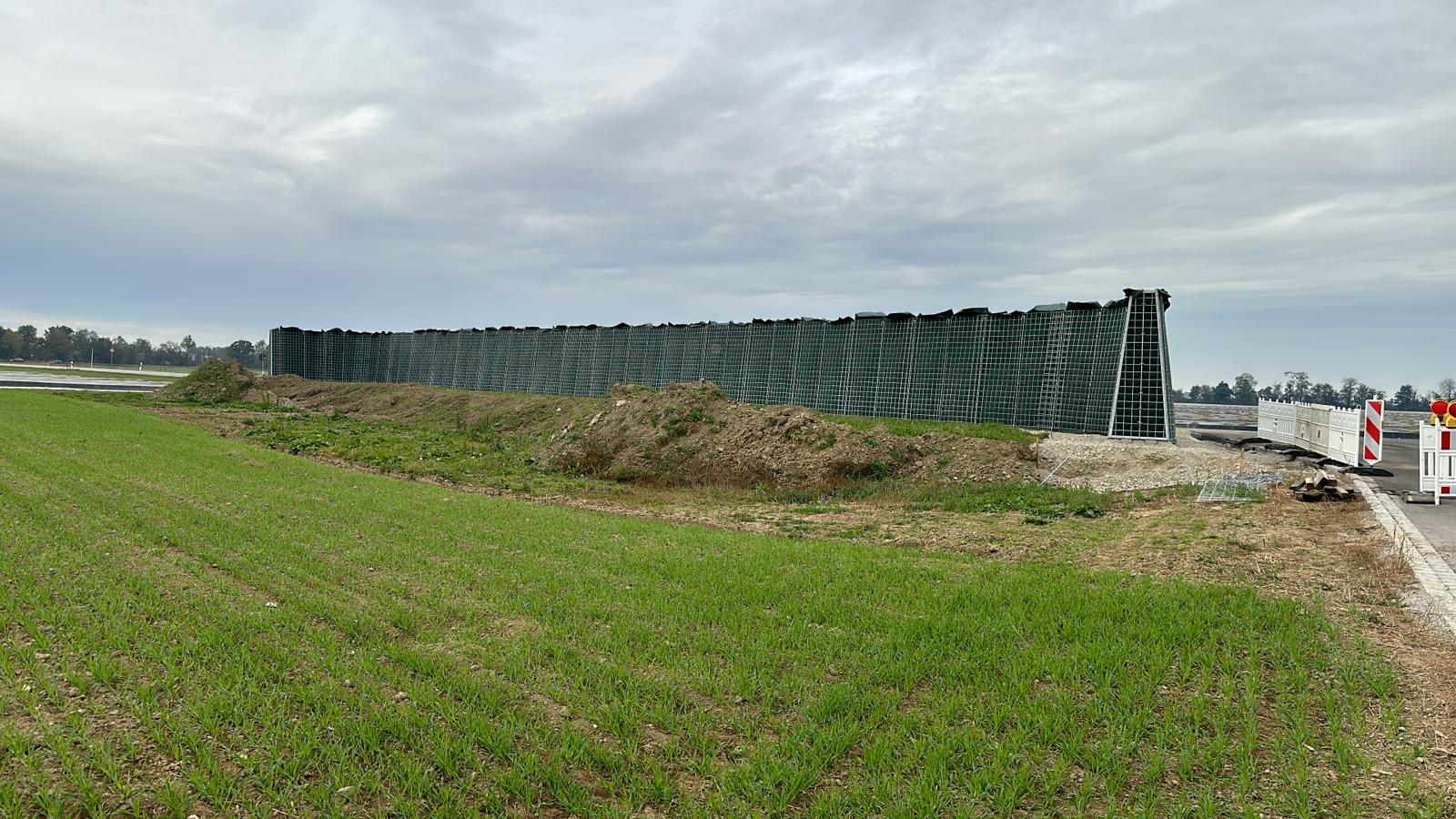 RAUbayern errichtet 204,15 m ökologischen Lärmschutz entlang des neuen Baugebietes in Mühldorf am Inn. An den zwei Durchlässen zum Wohngebiet und an Anfang und Ende wird die Lärmschutzwand in einem Viertelkreis gefertigt, um den seitlich auftreffenden Verkehrslärm effektiv abzuschirmen.