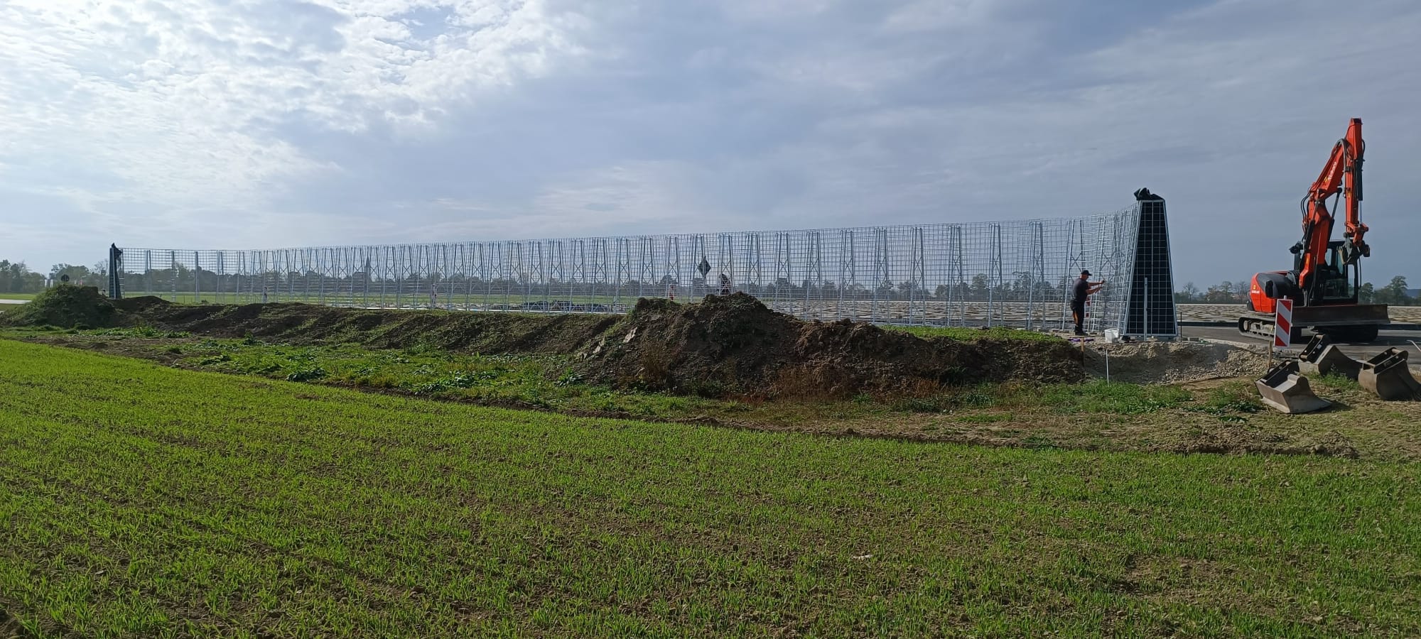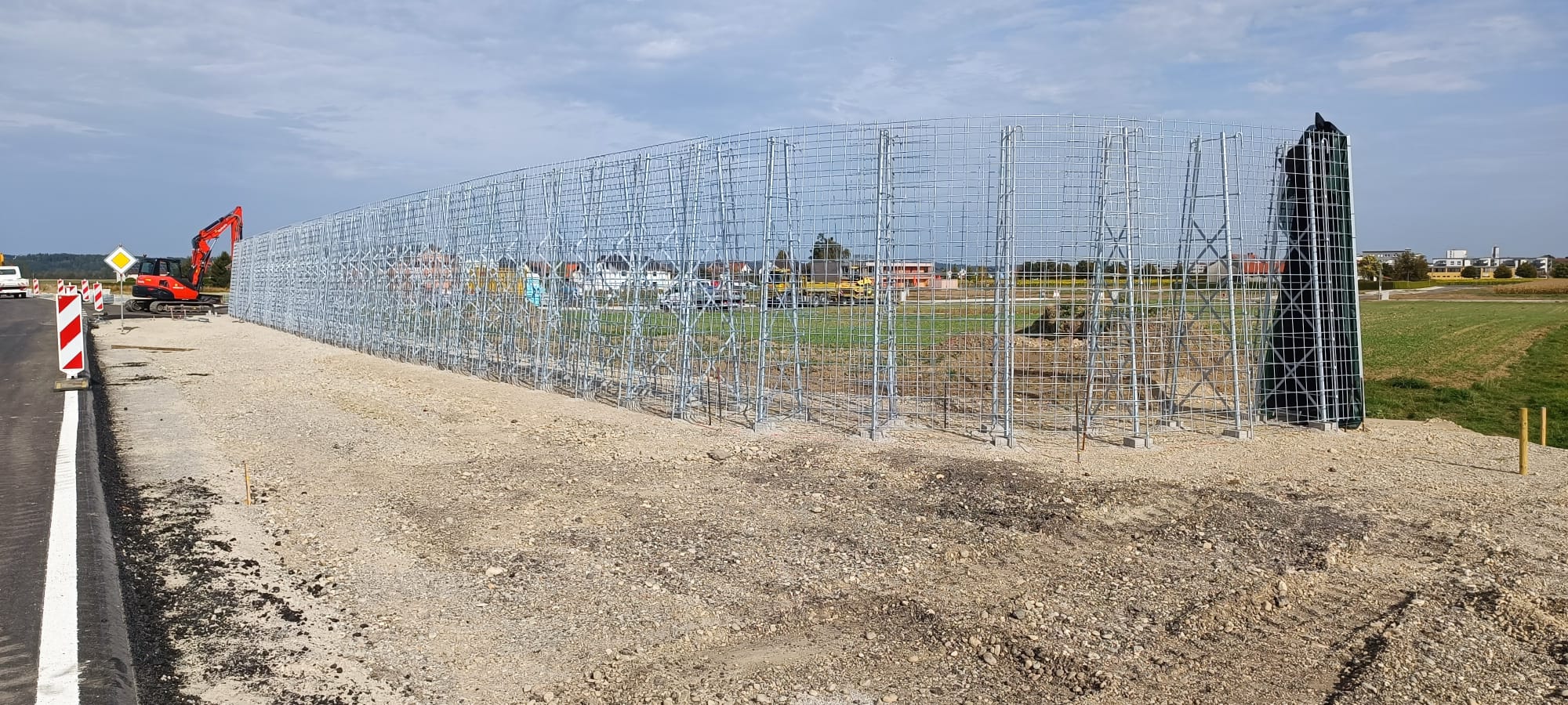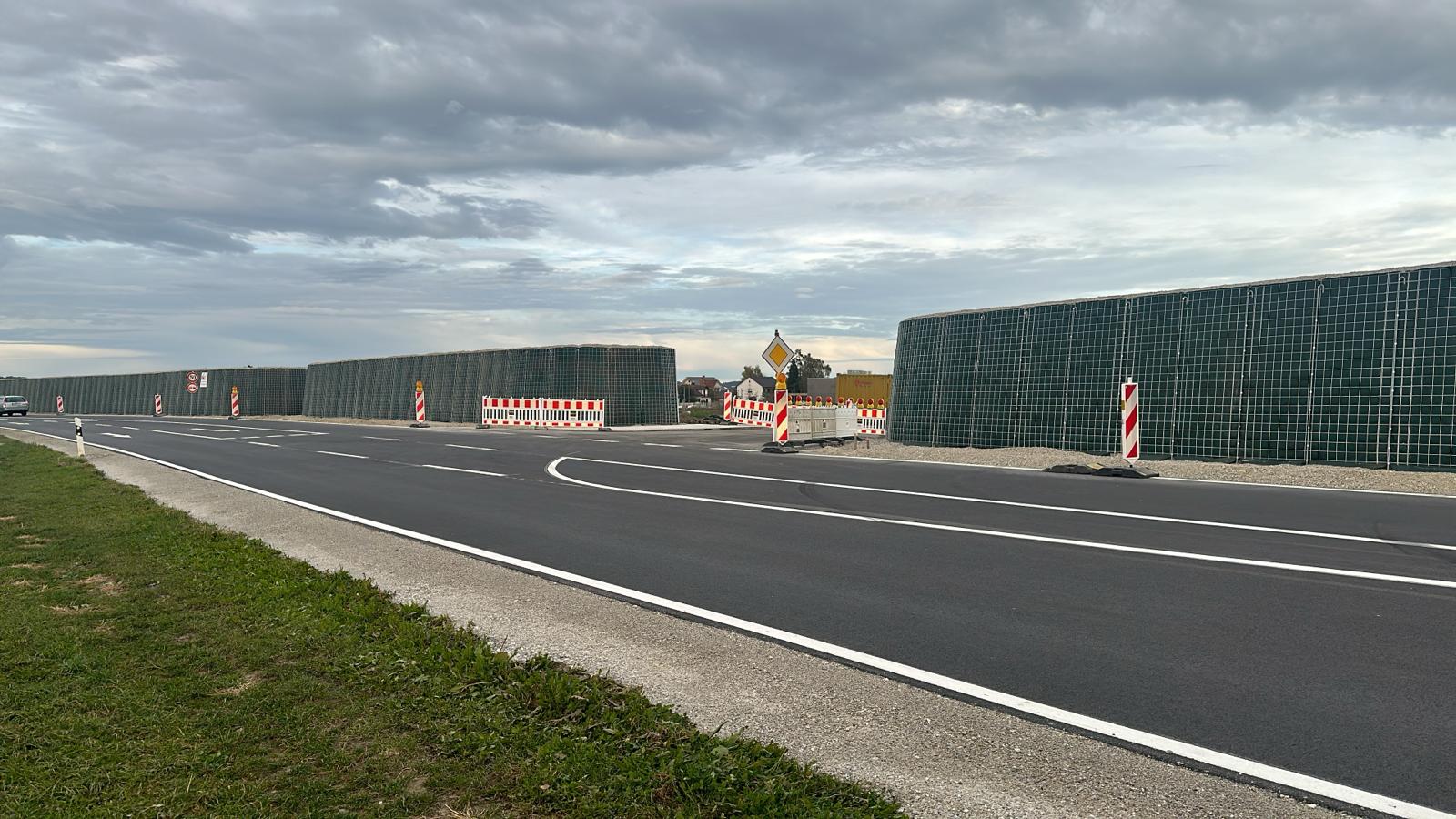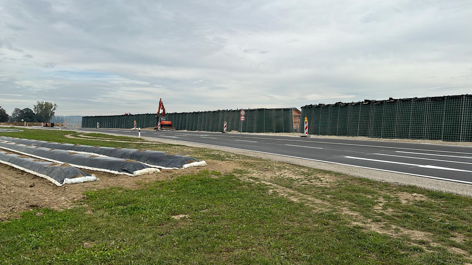 RAUbayern errichtet 204,15 m ökologischen Lärmschutz entlang des neuen Baugebietes in Mühldorf am Inn. An den zwei Durchlässen zum Wohngebiet und an Anfang und Ende wird die Lärmschutzwand in einem Viertelkreis gefertigt, um den seitlich auftreffenden Verkehrslärm effektiv abzuschirmen.