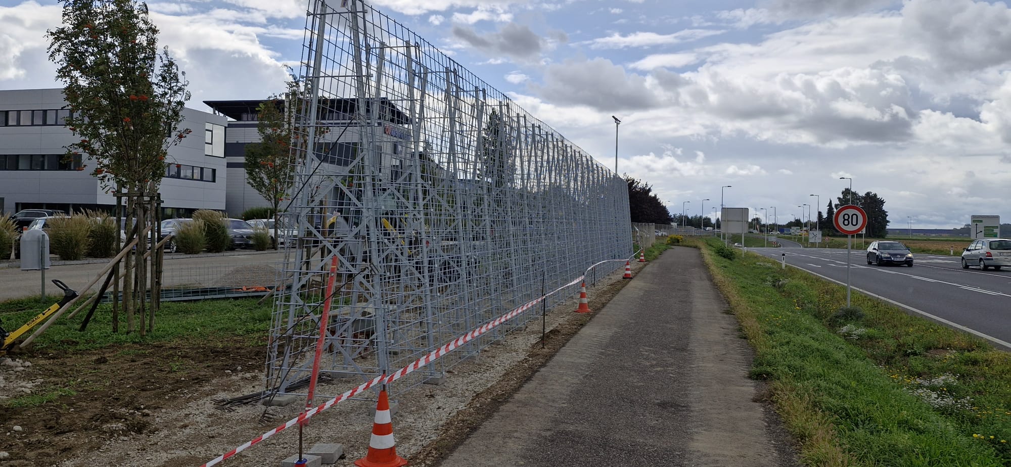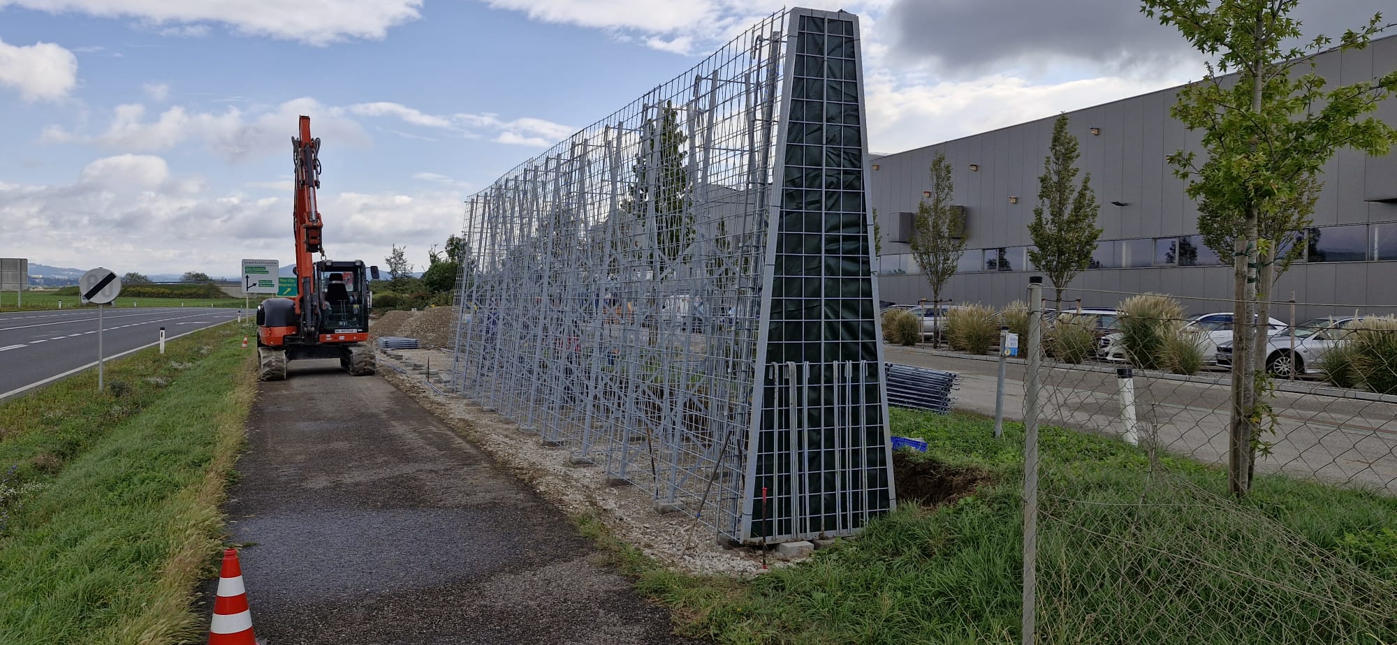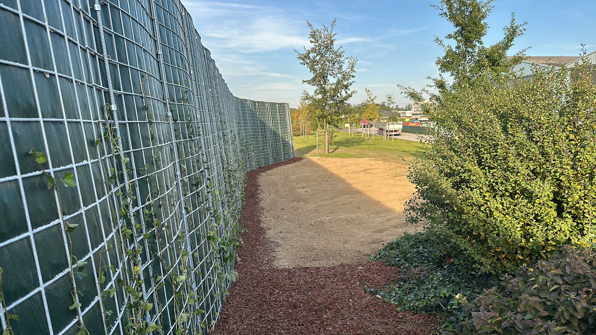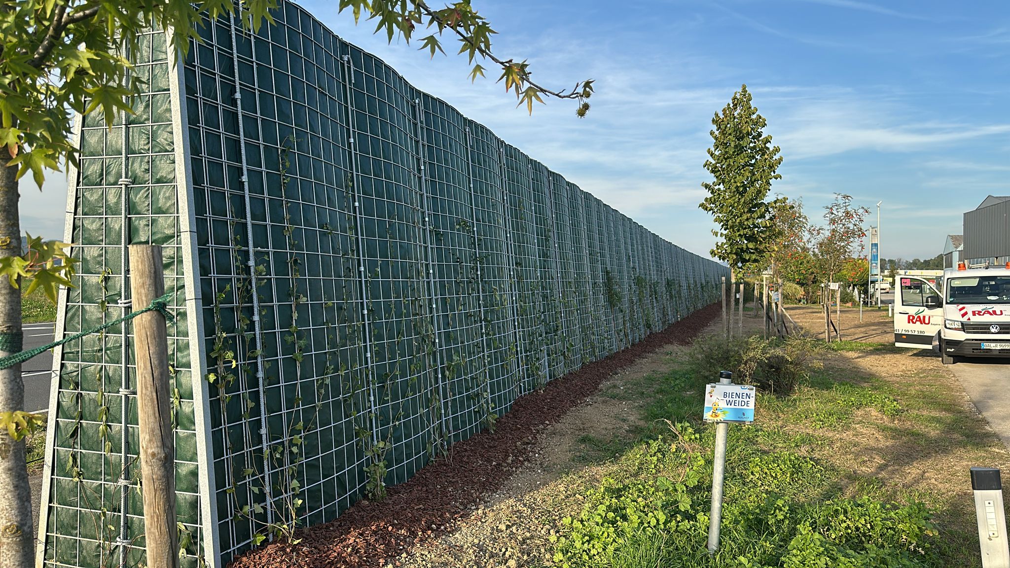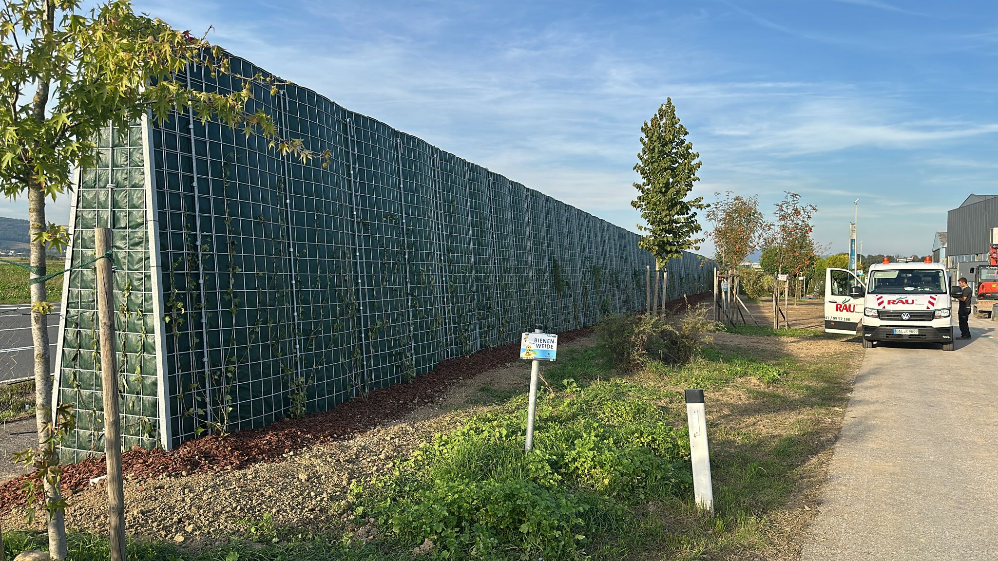 Zusätzlich zur grünen Bepflanzung der Lärmschutzwand mit pflegeleichtem und robusten Efeu legt der Auftraggeber davor ausgedehnte Bienenweiden an. In städtischen Gebieten und auf Gewerbegrund wird das Nahrungsangebot für Bienen immer knapper. Das Anlegen solcher Wiesen bildet die Grundlage zur Honigproduktion. Zusammen mit unserer ökologischen RAU Klimawand ein wertvoller Beitrag zum Erhalt von Insekten in der Natur.