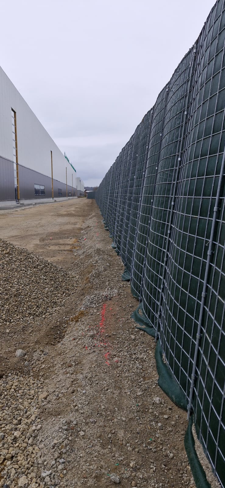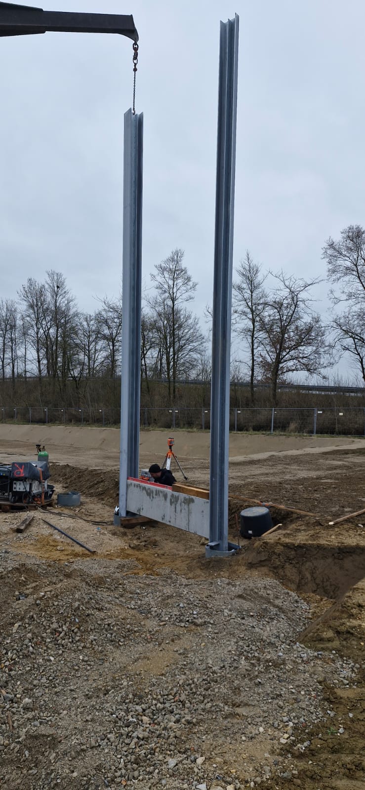 Eine 226 m lange RAU Klimawand (R3) mit einer Höhe von 3,00 m haben wir in rd. 1 Monat fertiggestellt. Die Stahlträger für die 50 Meter RAU Rock Wand mit 7,00 m Höhe stehen ebenfalls und sind einbetoniert. Sie wurden mittels Rammrohrbohrung durch unsere Kollegen aus Berlin „drehschlagend“ im Erdreich verankert. Auch die Betonschürzen sind bereits eingesetzt, sodass die RAU Rock Elemente demnächst eingeschoben werden können.